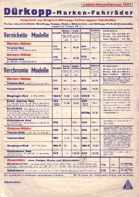 Dürkopp Fahrrad Preisliste 1937