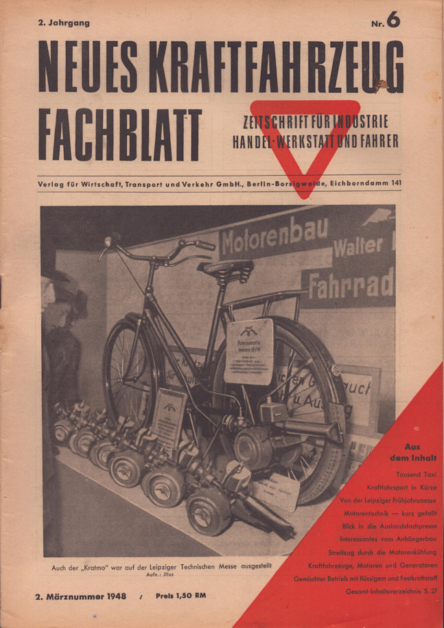 Zeitschrift für Industrie, Handel, Werkstatt und Fahrer, Berlin-Borsigwalde Kratmo (nur Titelseite) DKW F 9, DKW L 60 Motorrad Guter Zustand, Seiten 21/22 Motorentechnik fehlen
