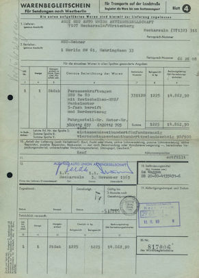 1 Seite DinA4 Warenbegleitschein für Sendungen nach West-Berlin, Beförderungsmittel war die Deutsche Bahn Guter Zustand, gelocht