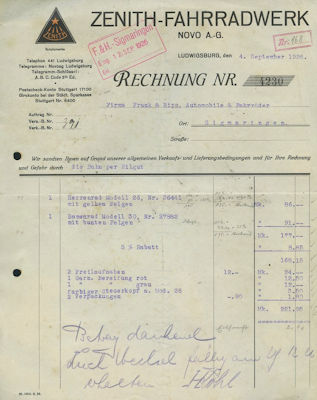 Zenith Fahrradwerk / Ludwigsburg Rechnung 1926