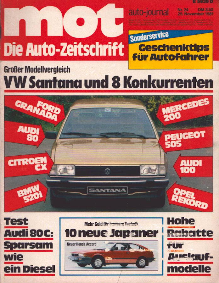 VW Santana / Audi 80 CD / Audi 100 CS / BMW 520i / Citroen CX Reflex / Ford Granada 2.3 L / Mercedes-Benz 200 / Opel Rekord 2.0 E Luxus / Peugeot 505 STI