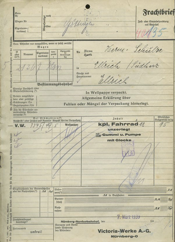 Victoria Frachtbrief Fahrrad 1939