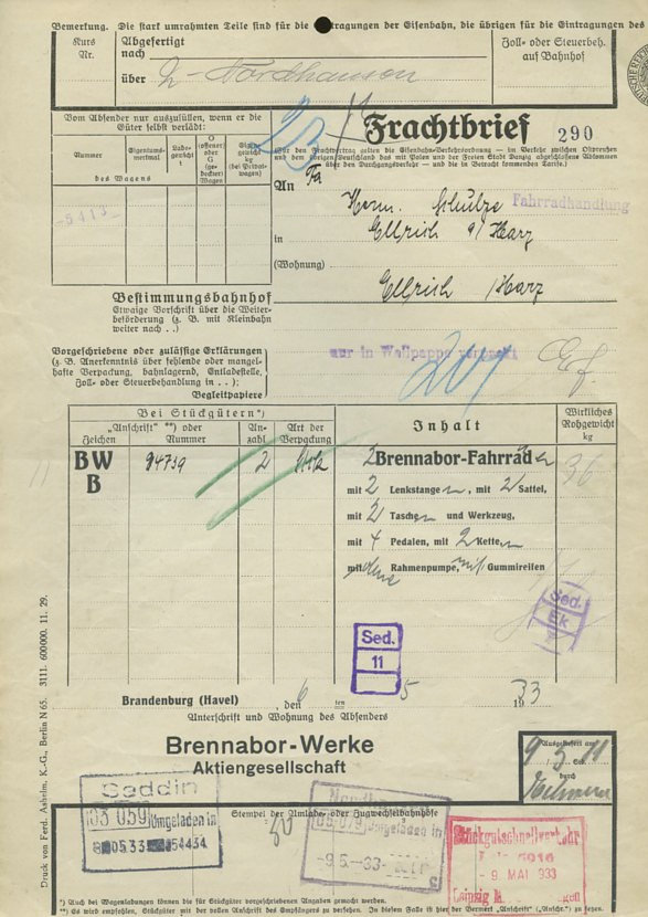 Brennabor Fahrrad Frachtbrief 1933