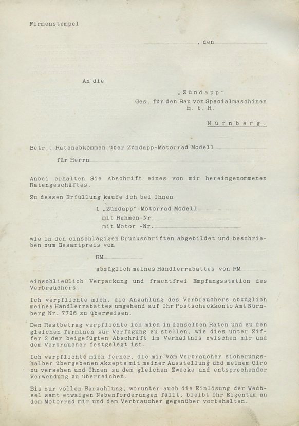 Zündapp Ratenabkommen blanko 1930er Jahre