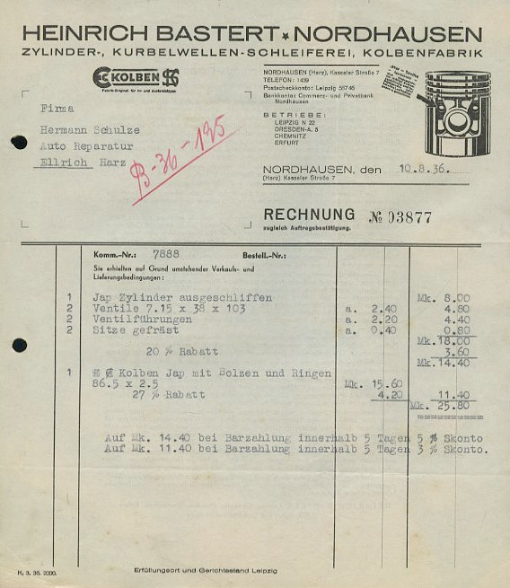 Heinrich Bastert, Nordhausen Rechnung 1930er Jahre