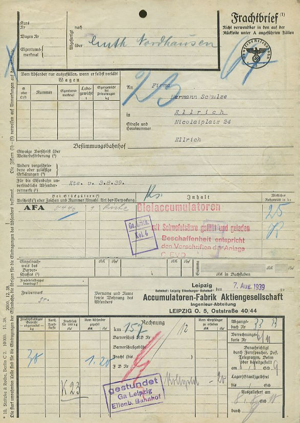Accumulatoren Fabrik, Leipzig Frachtbrief 1939