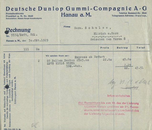 Deutsche Dunlop Gummi Companie, Hanau Rechnung 1929