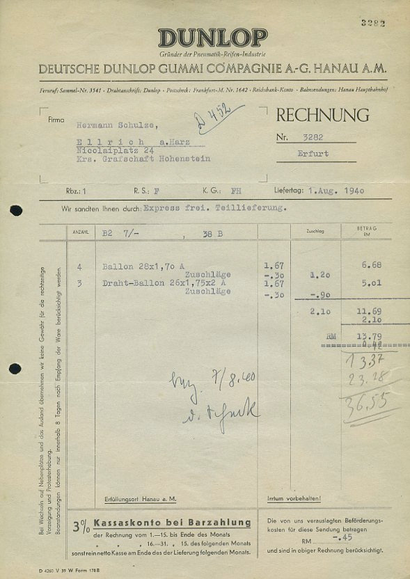 Deutsche Dunlop Gummi Companie, Hanau Rechnung 1940