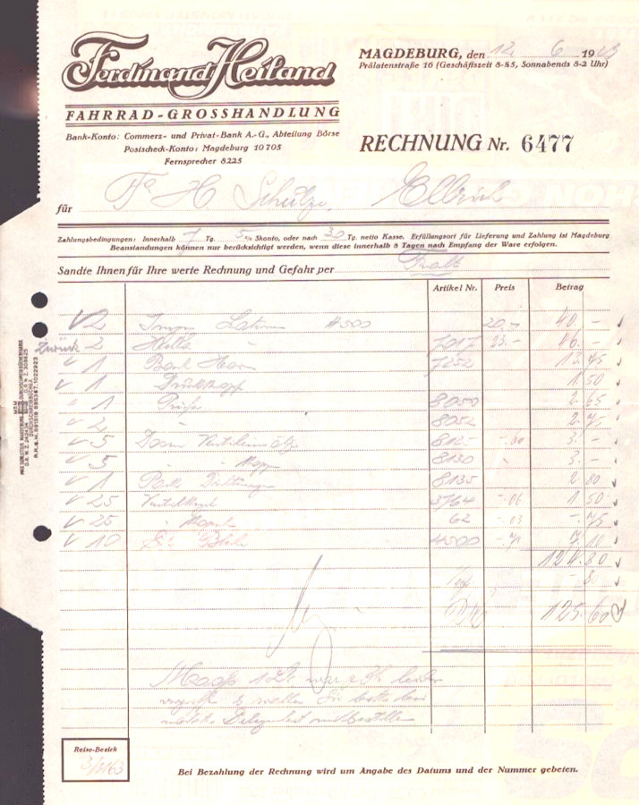 Ferdinand Heiland Fahrrad-Grosshandlung Rechnung 1929