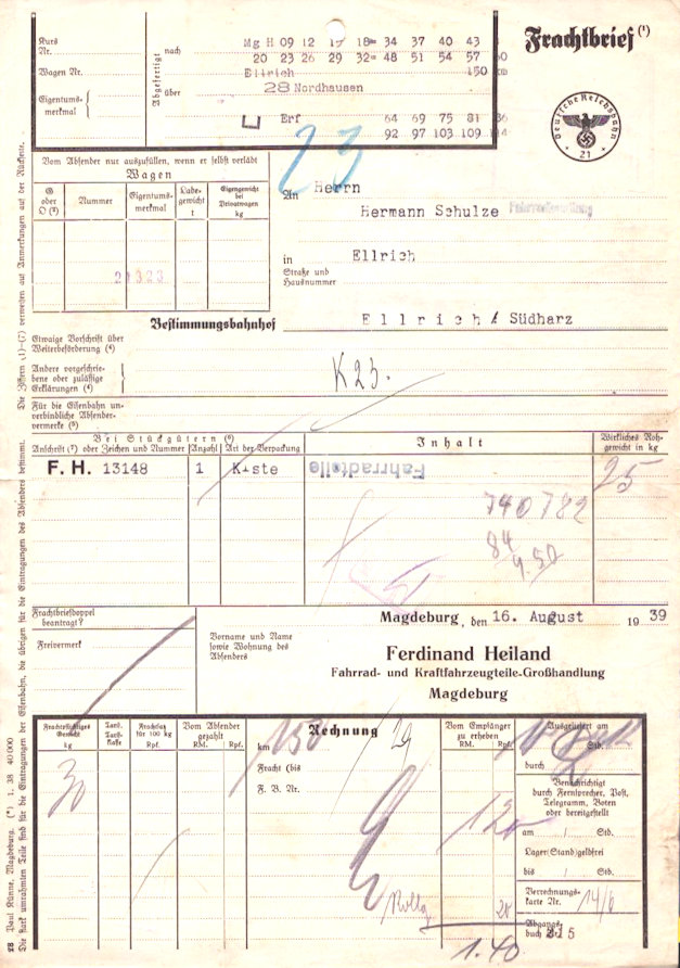 Ferdinand Heiland Fahrrad-Grosshandlung Frachtbrief 1938/39