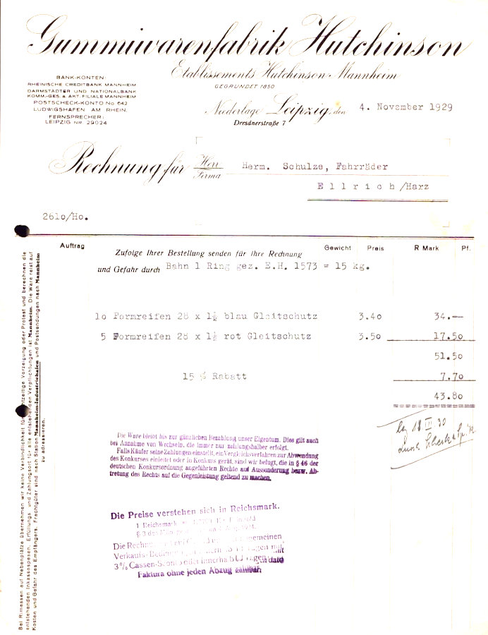 Gummiwarenfabrik Hutchinson Rechnung 1929