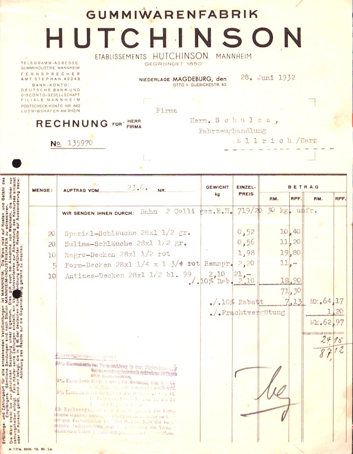 Gummiwarenfabrik Hutchinson Rechnung 1930-1932