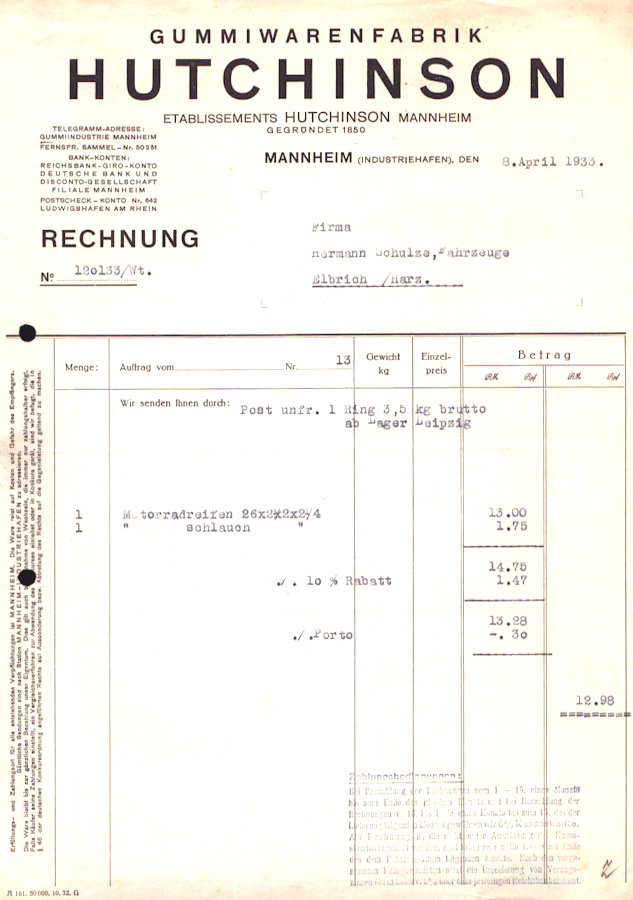 Gummiwarenfabrik Hutchinson Rechnung 1933