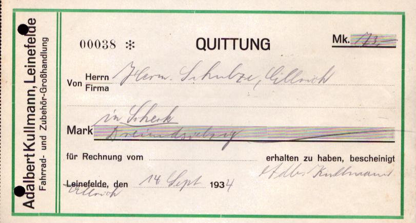 Adalbert Kullmann Leinefelde Quittung 1934