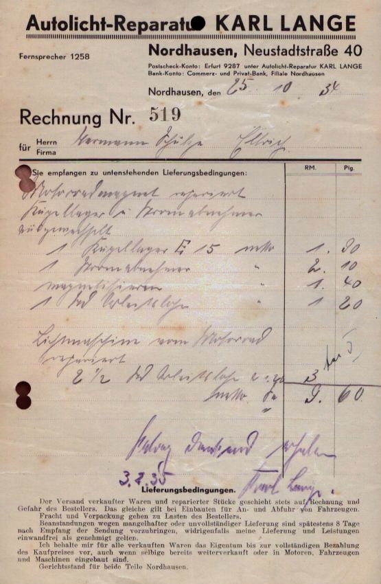 Karl Lange Autolicht-Reparatur Nordhausen Rechnung 1935-1938