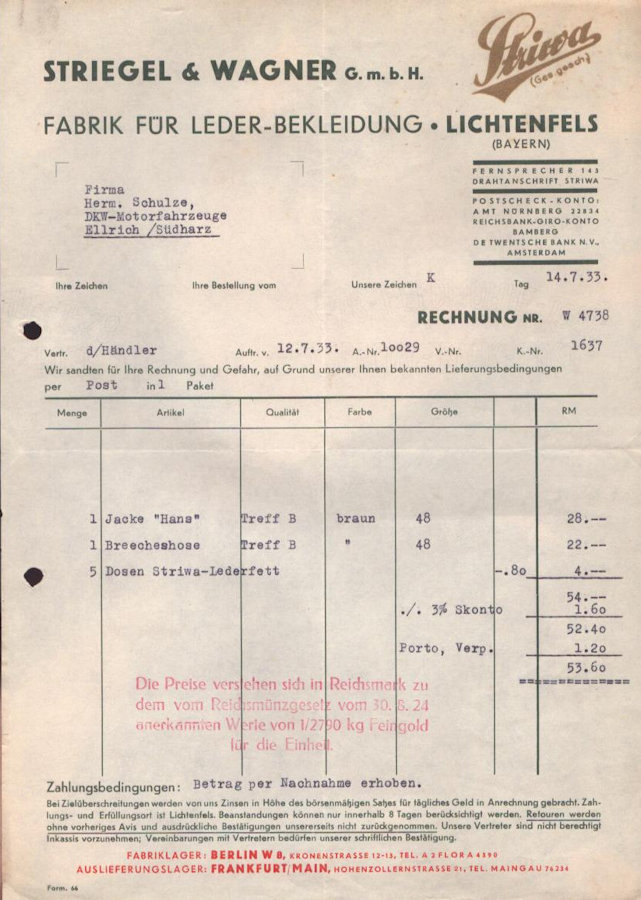 Striegel & Wagner Lichtenfels Rechnung 1933
