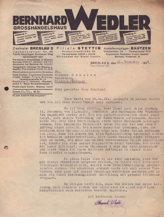 Bernhard Wendler Grosshandelshaus Breslau Schreiben 1934