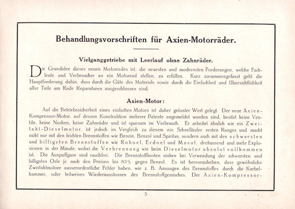 Axien Diesel Motorrad Bedienungsanleitung 1920er Jahre