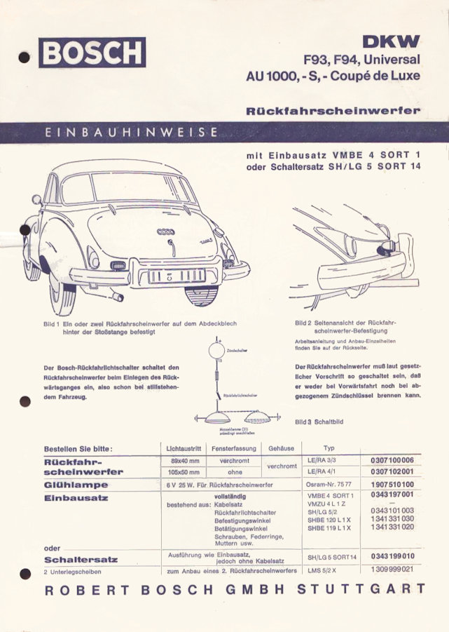 2 Seiten DinA4 Rückfahrscheinwerfer für F93, F94, Universal, AU 1000, -S und Coupé de Luxe Leichte Gebrauchsspuren
