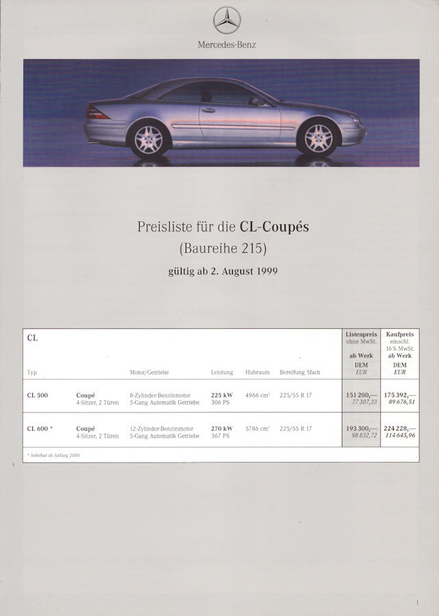 Mercedes-Benz CL-Coupes Preisliste 8.1999